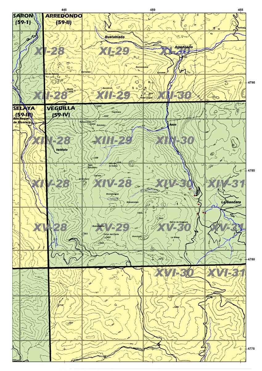 Le découpage des différentes feuilles couvrant la zone est représenté sur la carte d'assemblage ci-dessous. Les feuilles Arredondo et Veguilla couvrent à elles-seules 80% du massif.