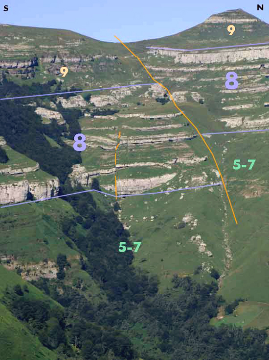 5-7 : grès d’Asón ; 8 : calcaires du Haut-Rolacía