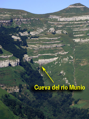 L'entrée de la cueva del Río Munio. De part et d'autre du porche, on distingue nettement le niveau des calcaires de transition, rognoneux, riches en débris de rudistes, de polypiers et de pectinidés. Ils marquent la transition entre les grés d'Asòn ( niveau 5) et les calcaires du Haut Rolacia (niveau 8).