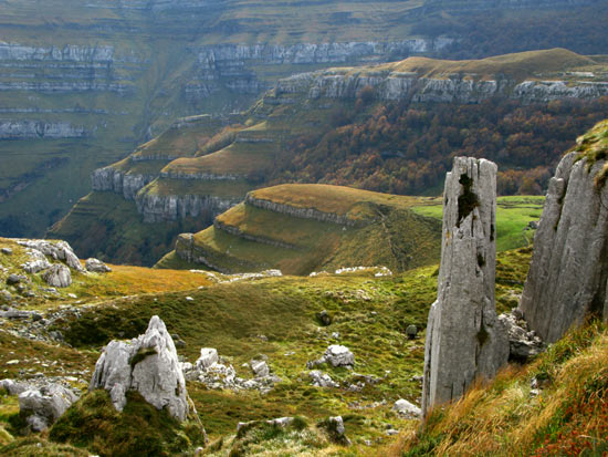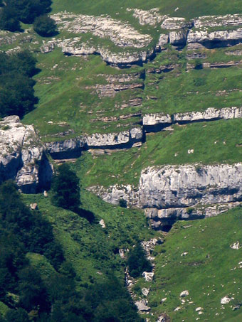 Le Haut Rolacia est caractérisé par de superbes gradins qui révèlent la stratigraphie. A droite, le plateau d'Helgueròn est occupé par quelques cabanes et paturages. La cueva del río Munio s'ouvre au bas du premier éperon, au centre de la photo.