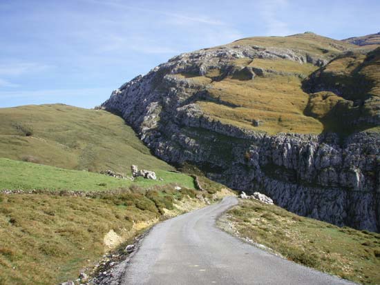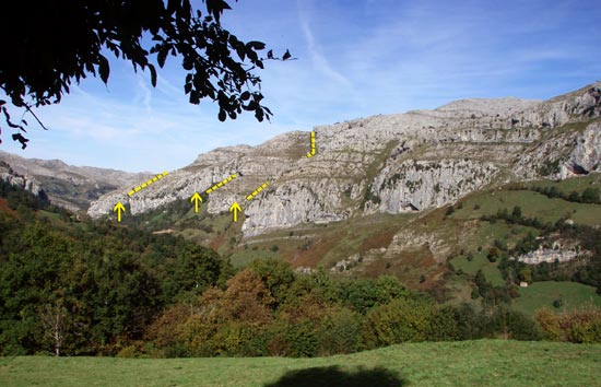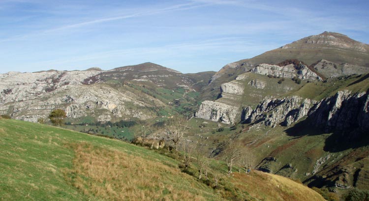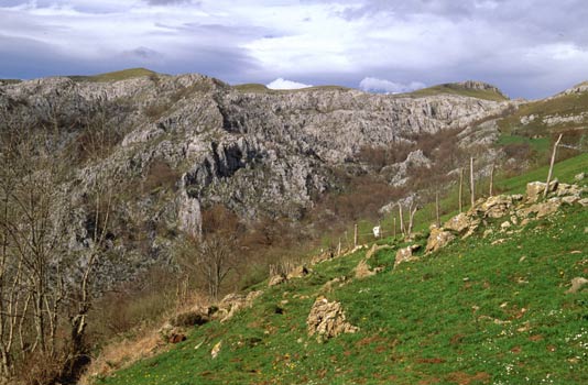 Brañas apacibles tropiezan con áridos lapiaces, bajo la influencia de la fracturación o la estratigrafía. Aquí, por ejemplo, al franquear la falla de Las Pasadas (visible a la derecha en la fotografía), pasamos de las landas sobre las areniscas de las cercanías de La Muela a los lapiaces acerados de Bordillas y el Alto del Tejuelo. Pero no hay que fiarse de las apariencias, ya que es posible encontrar cavidades importantes en cualquiera de los dos tipos de terreno. Por eso, el espeleólogo perspicaz deberá olvidar ciertos clichés y buscar en todos los rincones.